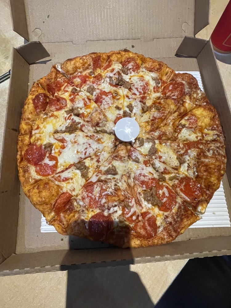 Our five-cheese blend, original red sauce, pepperoni, homemade recipe Italian sausage, roasted red peppers, green onions, tomatoes, chopped garlic, shredded aged Parmesan cheese.